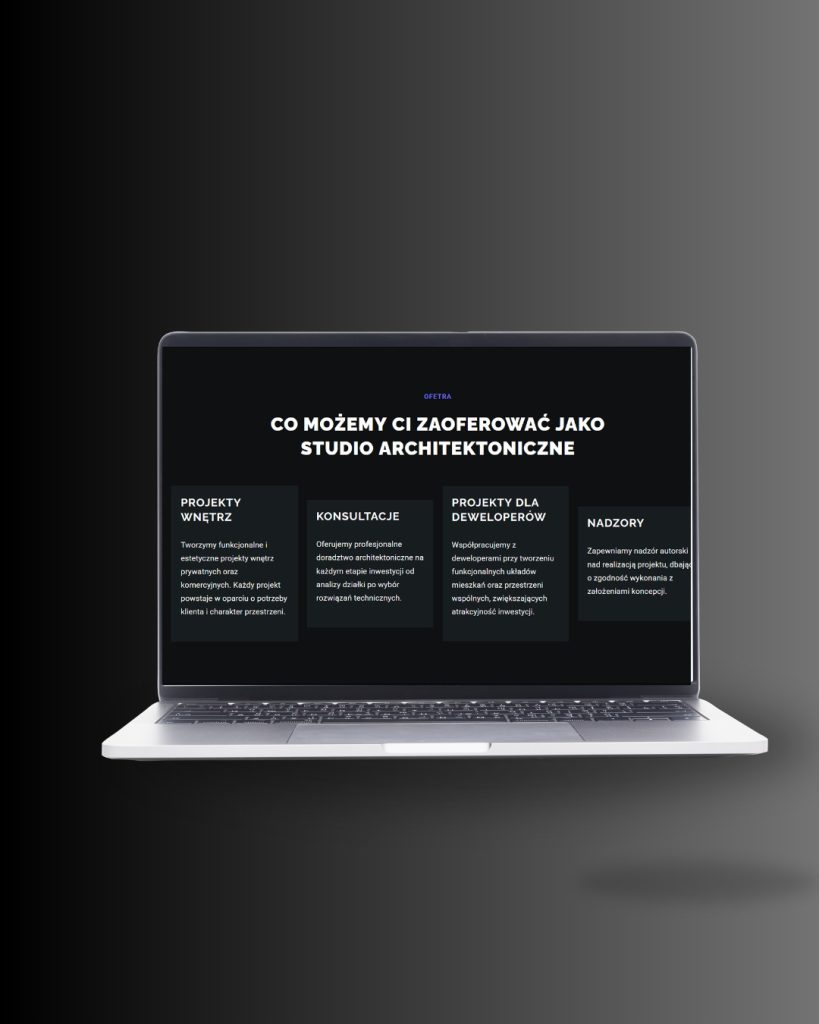 Projekt strony internetowej dla studia architektonicznego został przygotowany w wersji responsywnej, zoptymalizowanej pod urządzenia mobilne oraz wyszukiwarkę Google. Strona umożliwia łatwą rozbudowę o kolejne realizacje oraz integrację z narzędziami marketingowymi.